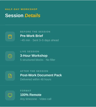 Every block of the session produces something tangible. By the end, you'll have a clear position and a plan you can act on the next day.
