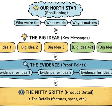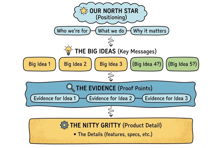 The rule is simple. Everything you create has to hold up against the levels above it. You can add product detail at the bottom without touching anything higher. But if a product change genuinely shifts one of your key messages or your positioning, that's a conscious decision, not a quick edit.